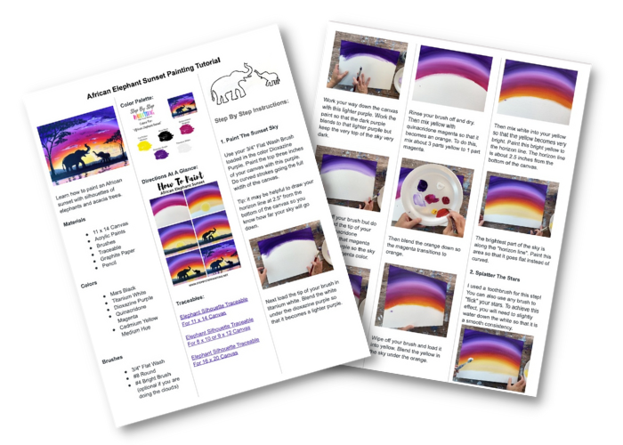 This is a PDF download for instructions on how to paint "African Elephant Silhouette Sunset". Beginner painting tutorial!