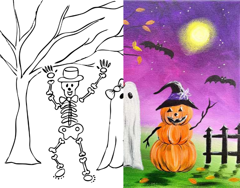 Skip the drawing portion of this tutorial and trace the skeleton, ghost, pumpkin and tree on your canvas! Templates are great to use if you are a beginner painter and you want to focus on the painting techniques OR if you are doing this for a DIY paint party.