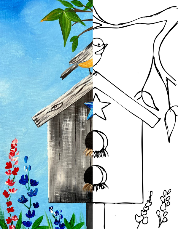 Download a PDF E-Lesson of this beautiful summer birdhouse with sparrow perched on the roof. The birdhouse is adorned with decorative blue star and red and blue flowers are growing around it.