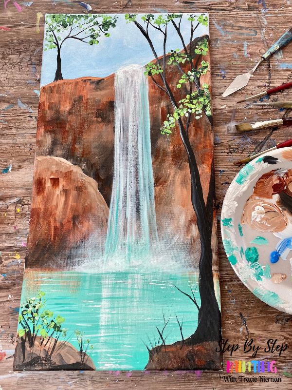 Learn how to paint a canyon waterfall with glowing turquoise water. This is a beginner painting tutorial done on a 10 x 20 canvas.