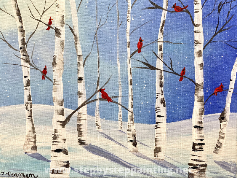 Download a PDF E-Lesson of this snowy cardinal forest scene. Paint a pretty blue background with simple birch trees and several tiny red cardinals perched in the tree.