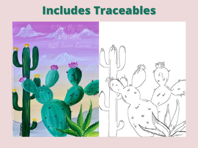 Download a PDF E-Lesson of this pretty pink and green desert scene. Paint a simple golden sunset with green cacti and colorful blossoms.