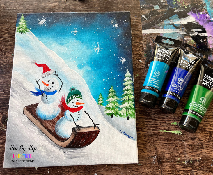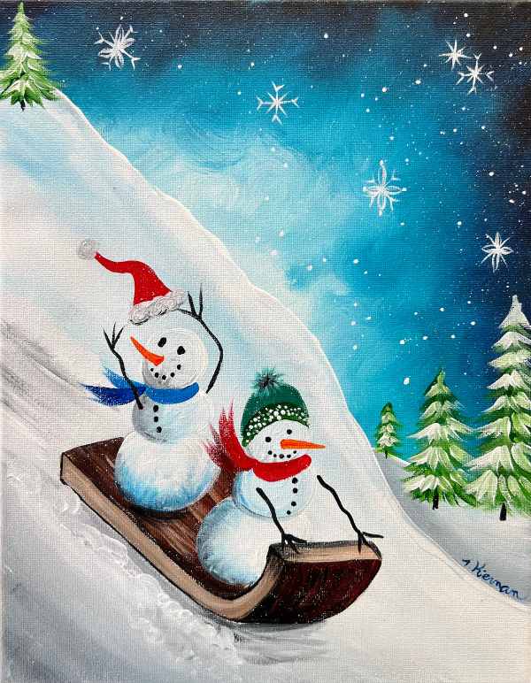 Our November exclusive is an adorable snowman themed painting! We are painting two snowmen going down a sled. We will be working on blending techniques to create that dreamy snowflake sky background as well as how to "shadow" snow for the 3D effect on the snowmen.