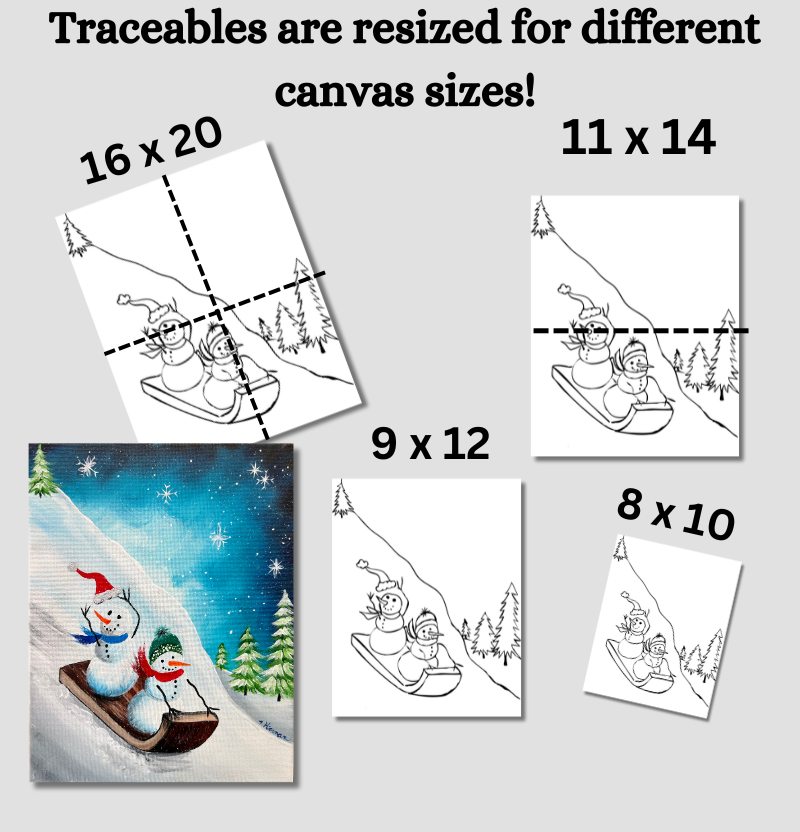 You can draw the snowmen and sleigh with Tracie in the video OR use the traceable templates! Traceables are sized to different canvas sizes so you can paint on any canvas size.