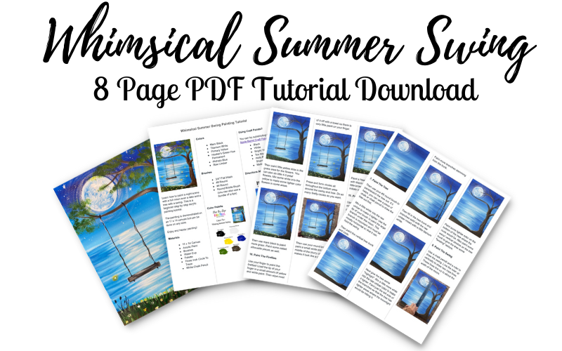 Gain access to an 8 page PDF tutorial download with picture instructions for how to paint "Whimsical Summer Swing". Materials list is in the PDF download.